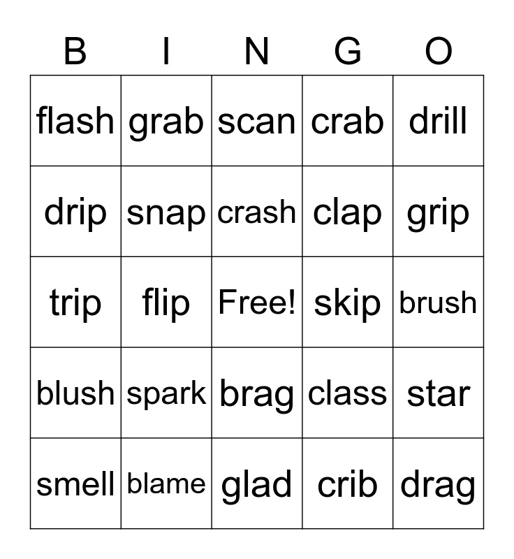 This bingo card has a free space and 24 words: spark, blame, crash, smell, drill, flash, drip, grab, skip, brag, clap, trip, class, star, snap, crib, brush, scan, grip, flip, drag, blush, crab and glad.