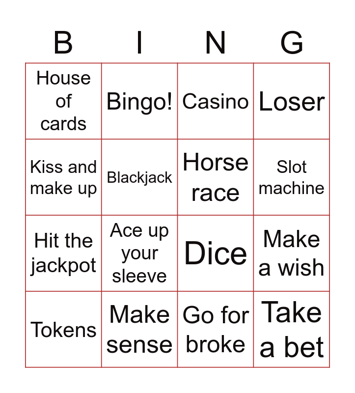 This bingo card has 19 words: Dice, Roulette, Casino, Take a bet, Make a wish, Kiss and make up, Go for broke, House of cards, Bingo!, Hit the jackpot, Ace up your sleeve, Blackjack, Horse race, Make sense, Tokens, Winer, Loser, Slot machine and Card.