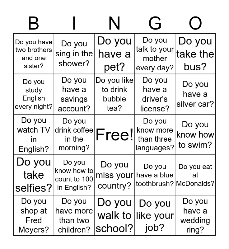 This bingo card has a free space and 24 words: Do you know how to count to 100 in English?, Do you have more than two children?, Do you like to drink bubble tea?, Do you shop at Fred Meyers?, Do you take the bus?, Do you have two brothers and one sister?, Do you study English every night?, Do you sing in the shower?, Do you know more than three languages?, Do you miss your country?, Do you have a driver's license?, Do you watch TV in English?, Do you have a blue toothbrush?, Do you eat at McDonalds?, Do you have a savings account?, Do you like your job?, Do you know how to swim?, Do you have a pet?, Do you have a silver car?, Do you drink coffee in the morning?, Do you have a wedding ring?, Do you take selfies?, Do you talk to your mother every day? and Do you walk to school?.