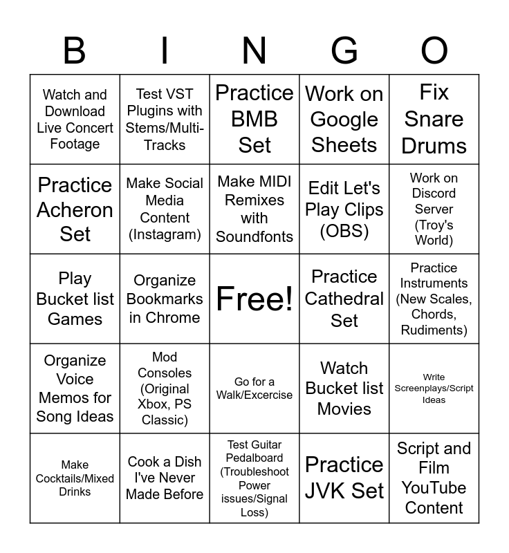 This bingo card has a free space and 24 words: Mod Consoles (Original Xbox, PS Classic), Cook a Dish I've Never Made Before, Make MIDI Remixes with Soundfonts, Make Cocktails/Mixed Drinks, Fix Snare Drums, Watch and Download Live Concert Footage, Practice Acheron Set, Test VST Plugins with Stems/Multi-Tracks, Practice Cathedral Set, Go for a Walk/Excercise, Edit Let's Play Clips (OBS), Play Bucket list Games, Watch Bucket list Movies, Write Screenplays/Script Ideas, Make Social Media Content (Instagram), Practice JVK Set, Practice Instruments (New Scales, Chords, Rudiments), Practice BMB Set, Work on Discord Server (Troy's World), Organize Bookmarks in Chrome, Script and Film YouTube Content, Organize Voice Memos for Song Ideas, Work on Google Sheets and Test Guitar Pedalboard (Troubleshoot Power issues/Signal Loss).