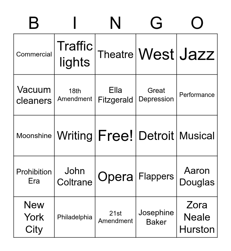 This bingo card has a free space and 42 words: Louis Armstrong, Ella Fitzgerald, Miles Davis, John Coltrane, Josephine Baker, Aaron Douglas, Zora Neale Hurston, Paul Robeson, Theatre, Opera, Musical, Performance, Writing, Jazz, Blues, Flappers, Suffrage, Moonshine, Radios, Traffic lights, Vacuum cleaners, Television, Electric Blender, Commercial, Automobile, Great Migration, Great Depression, Jazz Age, Roarin’ 20s, World War I, Stock Market Crash, Prohibition Era, 18th Amendment, 21st Amendment, Chicago, New York City, Philadelphia, Detroit, North, South, West and Midwest.