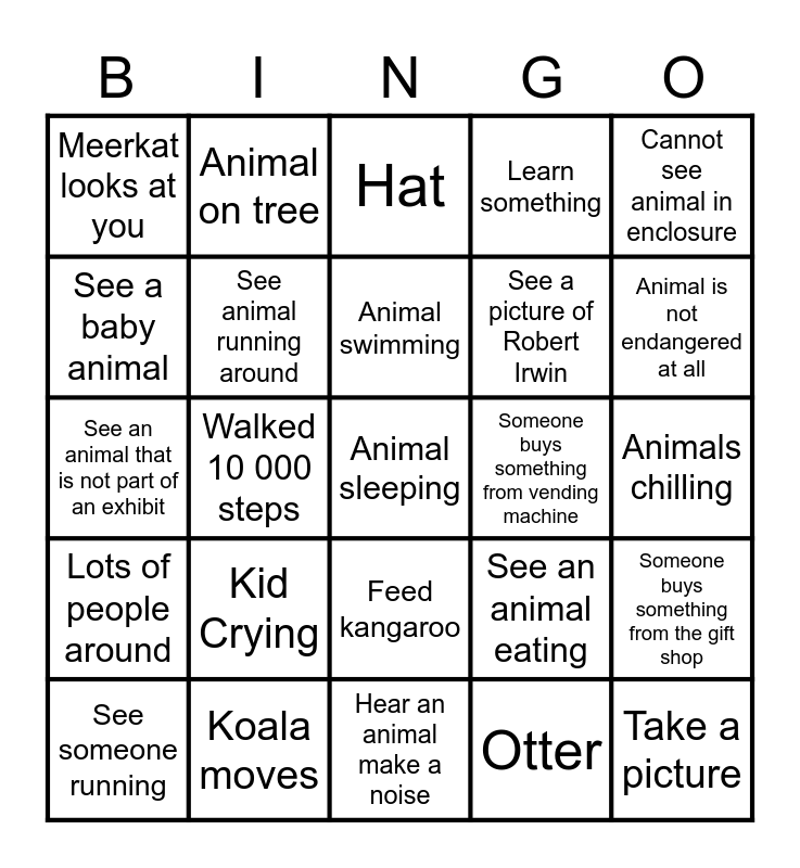 This bingo card has 25 words: Kid Crying, Hear an animal make a noise, Animal swimming, See someone running, Cannot see animal in enclosure, Meerkat looks at you, See a baby animal, Animal on tree, Someone buys something from vending machine, Feed kangaroo, See a picture of Robert Irwin, See an animal that is not part of an exhibit, See an animal eating, Someone buys something from the gift shop, See animal running around, Take a picture, Animals chilling, Hat, Animal is not endangered at all, Walked 10 000 steps, Animal sleeping, Koala moves, Lots of people around, Learn something and Otter.