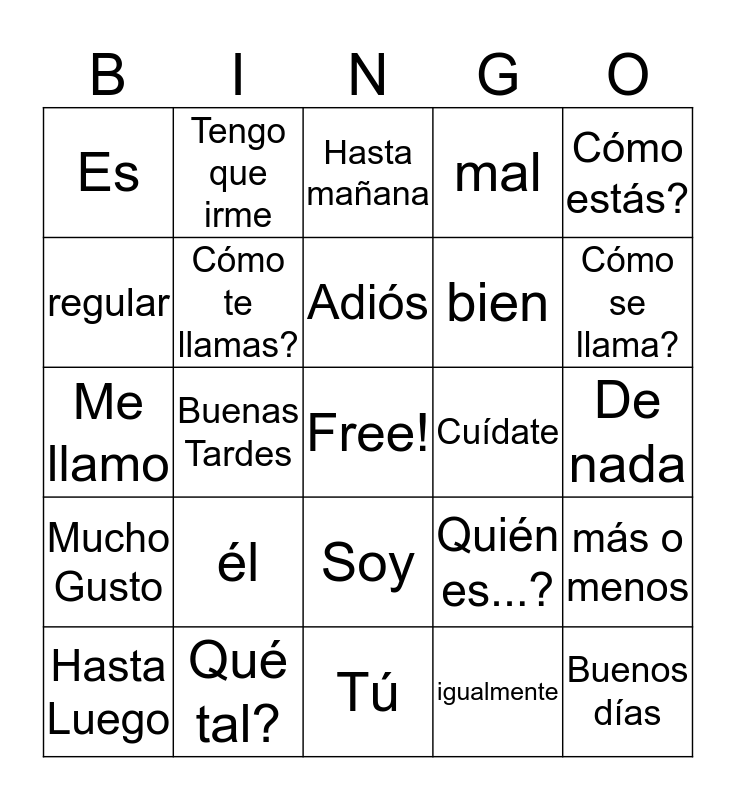 This bingo card has a free space and 33 words: Hola, Buenas Noches, Buenas Tardes, Encantado, Mucho Gusto, Cómo te llamas?, Cómo estás?, Hasta Luego, Tengo que irme, Gracias, Adiós, Hasta mañana, usted, Nos vemos, Cuídate, Cómo se llama?, Qué tal?, Me llamo, él, Quién es...?, Soy, Ella, Es, De nada, Tú, Buenos días, mal, bien, regular, más o menos, y, igualmente and Cómo te llamas?.