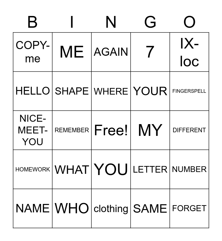 This bingo card has a free space and 24 words: WHAT, WHO, WHERE, NAME, IX-loc, COPY-me, HELLO, ME, MY, YOU, YOUR, NICE-MEET- YOU, LETTER, NUMBER, SHAPE, SAME, DIFFERENT, AGAIN, FINGERSPELL, REMEMBER, FORGET, HOMEWORK, 7 and clothing.