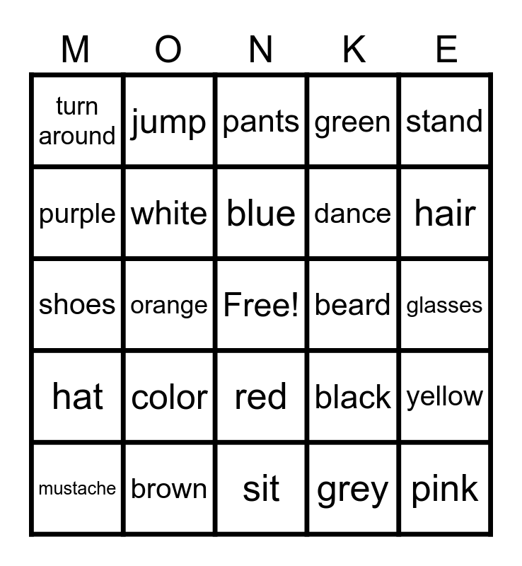 This bingo card has a free space and 24 words: mustache, color, blue, grey, stand, turn around, jump, pants, beard, glasses, shoes, white, black, yellow, purple, brown, sit, green, hair, hat, orange, red, dance and pink.