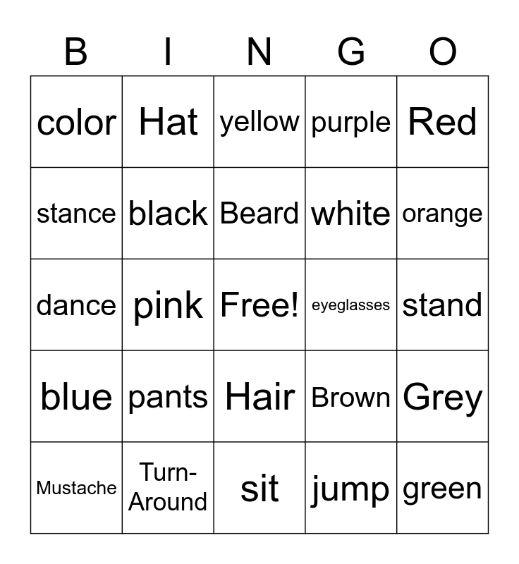 This bingo card has a free space and 24 words: pants, Turn-Around, Beard, Mustache, Red, color, stance, Hat, eyeglasses, Hair, white, dance, Brown, Grey, black, jump, stand, yellow, orange, pink, green, blue, purple and sit.