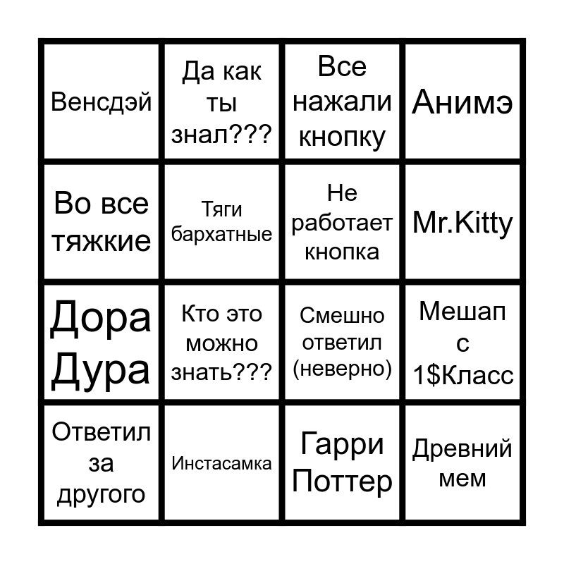 This bingo card has 16 words: Инстасамка, Мешап с 1$Класс, Все нажали кнопку, Венсдэй, Дора Дура, Да как ты знал???, Смешно ответил (неверно), Гарри Поттер, Во все тяжкие, Тяги бархатные, Ответил за другого, Анимэ, Кто это можно знать???, Mr.Kitty, Не работает кнопка and Древний мем.