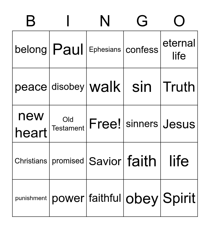 This bingo card has a free space and 24 words: promised, power, walk, punishment, eternal life, belong, peace, Paul, sinners, Savior, sin, new heart, faith, life, disobey, obey, Jesus, Ephesians, Truth, Old Testament, Spirit, Christians, confess and faithful.