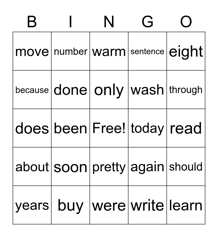 This bingo card has a free space and 60 words: would, buy, people, about, write, once, done, water, wash, upon, sentence, off, because, laugh, open, move, learn, eight, house, only, today, warm, years, should, world, mother, father, another, through, picture, other, right, may, give, number, carry, going, been, words, does, both, soon, read, how, again, away, our, light, never, pretty, were, pull, every, any, very, new, thank, always, found and please.