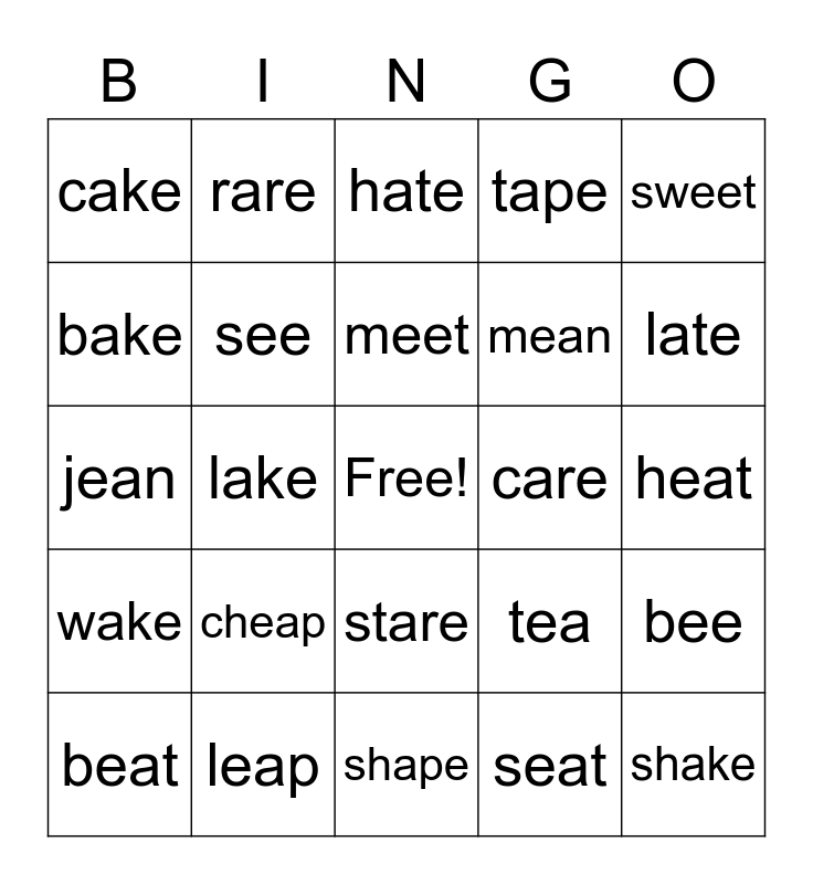 This bingo card has a free space and 24 words: cheap, leap, meet, beat, sweet, cake, bake, rare, care, stare, mean, jean, tea, bee, see, seat, heat, hate, late, lake, shake, wake, tape and shape.