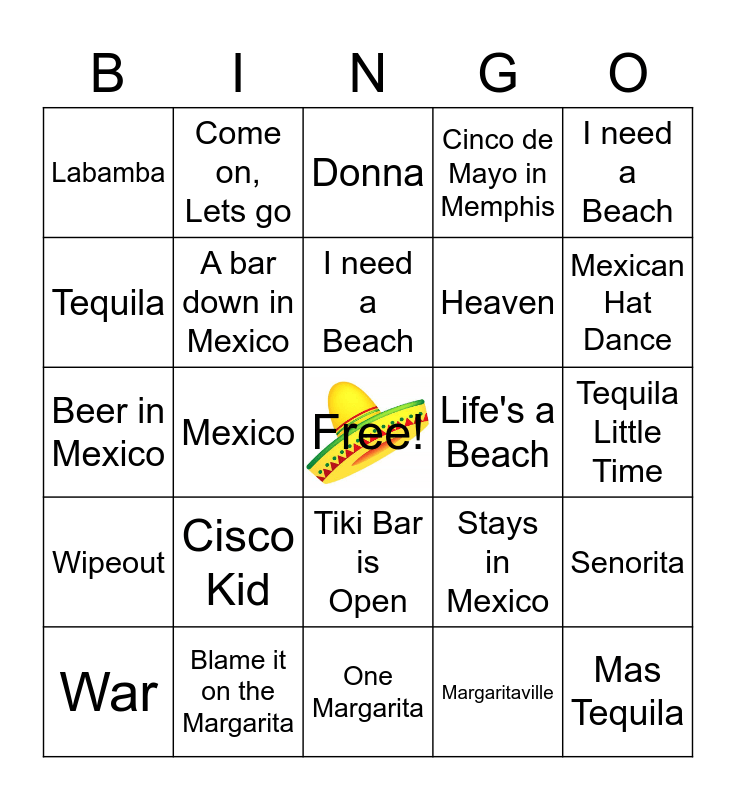 This bingo card has a free space and 25 words: War, Cisco Kid, I need a Beach, Margaritaville, Mexican Hat Dance, Labamba, Come on, Lets go, Donna, Heaven, Senorita, Beer in Mexico, A bar down in Mexico, Stays in Mexico, Mas Tequila, Tequila, Blame it on the Margarita, One Margarita, Cinco de Mayo in Memphis, Tequila Little Time, Wipeout, Mexico, Tiki Bar is Open, Life's a Beach, I need a Beach and Guitars and tiki Bars.