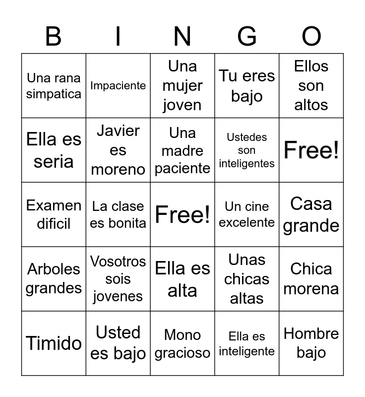 This bingo card has a free space and 34 words: Yo soy rubia, Ella es inteligente, Nosotros somos altos, Casa vieja, Arboles grandes, Javier es moreno, Ellos son altos, Timido, Impaciente, Libro excelente, Una madre paciente, Una mujer joven, Nosotros somos viejos, Inocente, Un cine excelente, Free!, Usted es bajo, Examen dificil, Vosotros sois jovenes, Unas chicas altas, Ella es alta, Nosotros somos rubios, Una rana simpatica, Casa grande, Mono gracioso, Hombre bajo, Tu eres bajo, La chica es bonita, Ustedes son inteligentes, Ella es seria, Maestra aburrida, La clase es bonita, Chica morena and Un pais independiente.