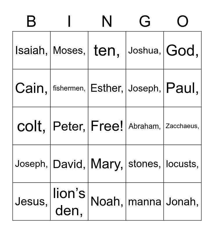 This bingo card has a free space and 25 words: David,, Noah,, Esther,, Jesus,, God,, Isaiah,, Cain,, Moses,, Abraham,, Mary,, Joseph,, colt,, stones,, locusts,, fishermen,, tax collector,, Zacchaeus,, ten,, Paul,, Peter,, Jonah,, lion’s den,, Joseph,, Joshua, and manna.