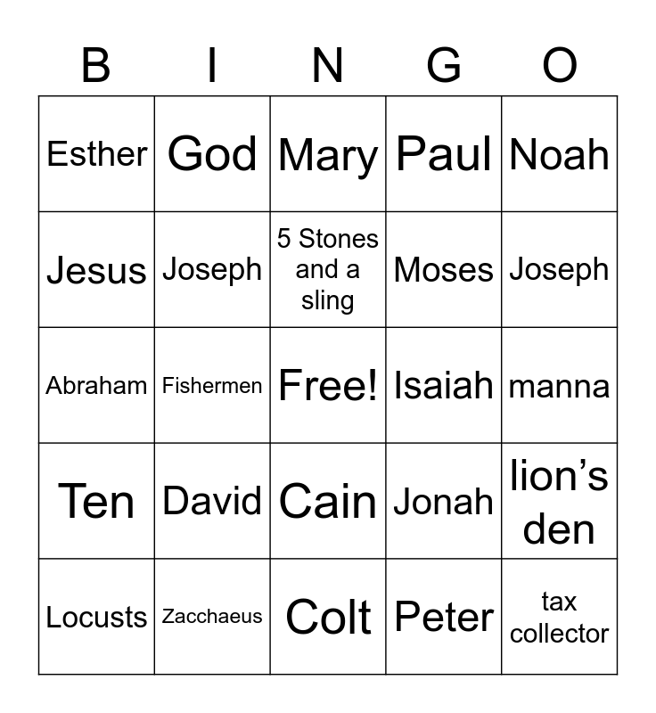 This bingo card has a free space and 25 words: David, Colt, 5 Stones and a sling, Locusts, Noah, Esther, Jesus, God, Isaiah, Cain, Moses, Abraham, Jonah, lion’s den, Joseph, Joshua, manna, Mary, Joseph, Fishermen, tax collector, Zacchaeus, Ten, Paul and Peter.