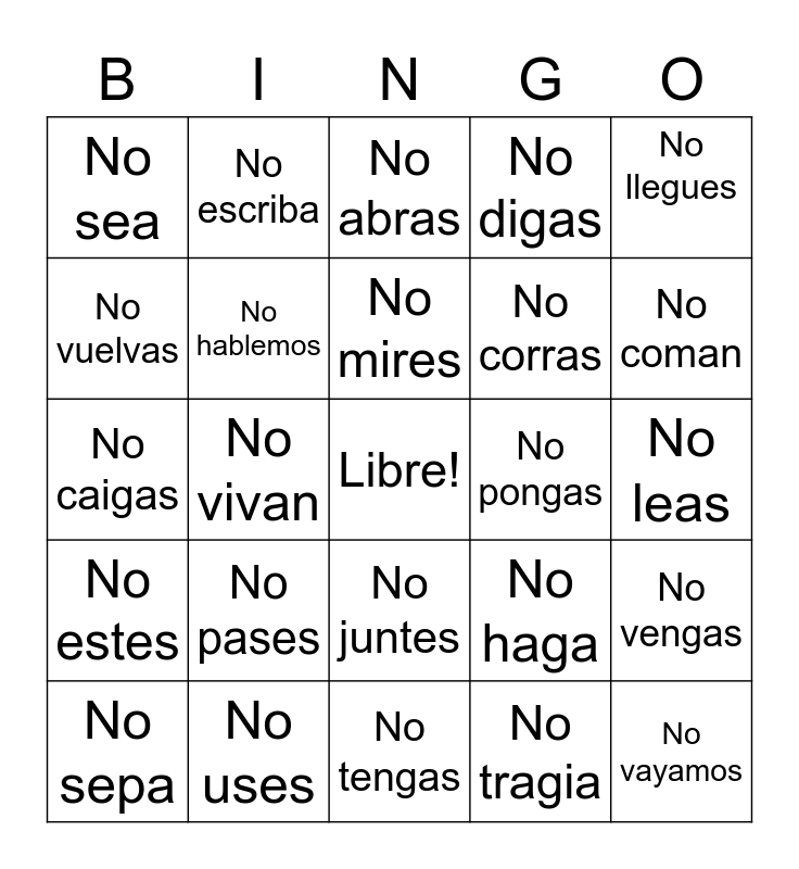 This bingo card has a free space and 24 words: No pases, No uses, No mires, No sepa, No llegues, No sea, No vuelvas, No escriba, No pongas, No juntes, No corras, No caigas, No haga, No vengas, No hablemos, No tragia, No leas, No abras, No coman, No vivan, No vayamos, No estes, No digas and No tengas.