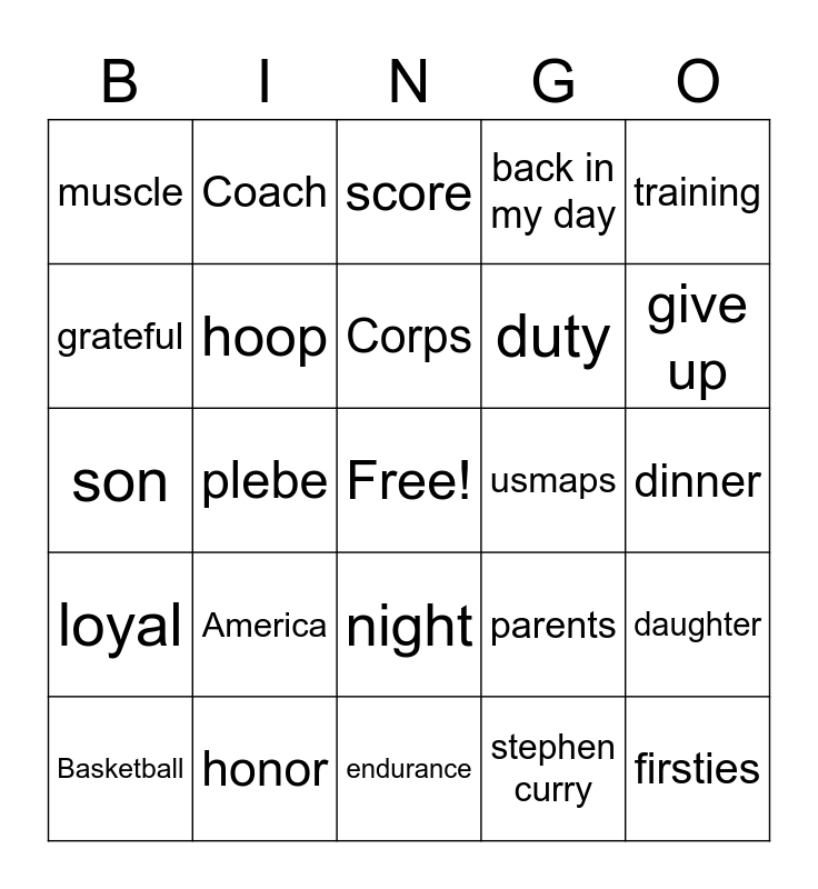 This bingo card has a free space and 27 words: parents, persistence, duty, endurance, grateful, score, Coach, loyal, usmaps, daughter, son, back in my day, Basketball, honor, give up, leaders, hoop, Corps, America, muscle, dinner, stephen curry, plebe, firsties, night, training and harsh.