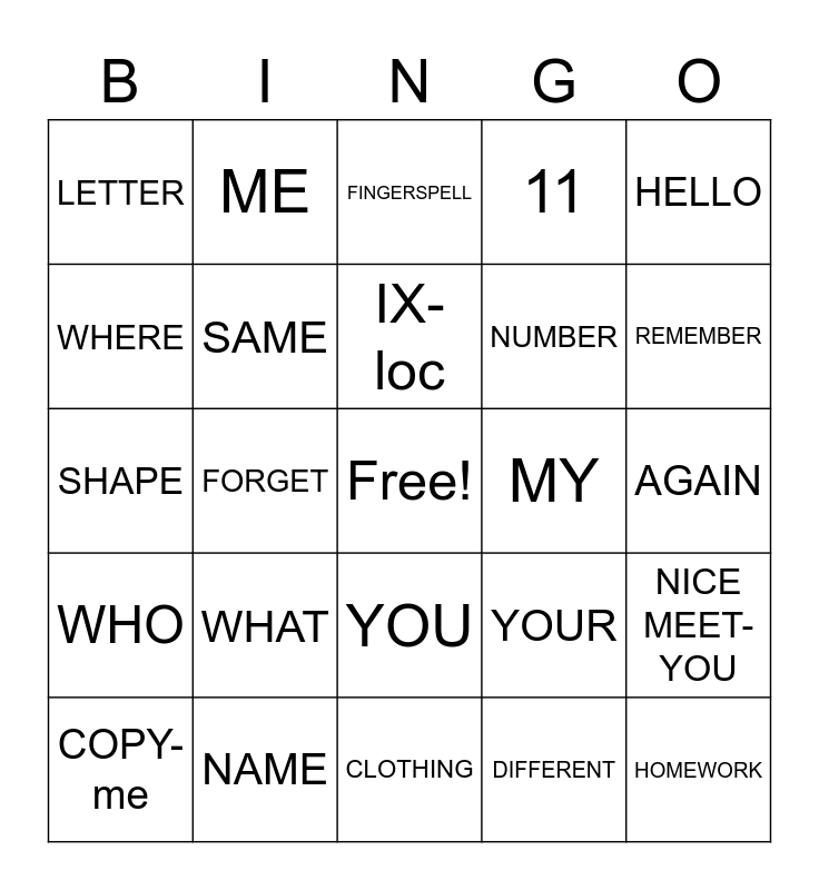 This bingo card has a free space and 24 words: WHAT, NAME, IX-loc, COPY-me, HELLO, LETTER, WHERE, ME, MY, YOU, NUMBER, SHAPE, YOUR, NICE MEET-YOU, SAME, DIFFERENT, AGAIN, FINGERSPELL, REMEMBER, FORGET, HOMEWORK, WHO, 11 and CLOTHING.