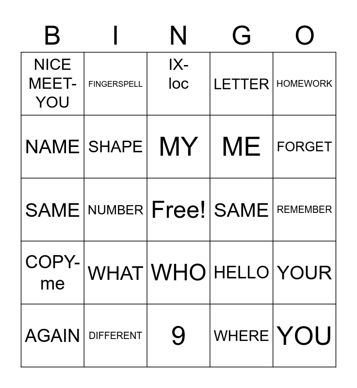 This bingo card has a free space and 24 words: WHAT, DIFFERENT, MY, AGAIN, HOMEWORK, NICE MEET-YOU, NAME, FINGERSPELL, SAME, WHO, ME, SAME, HELLO, YOUR, SHAPE, WHERE, REMEMBER, IX-loc, FORGET, NUMBER, YOU, COPY-me, LETTER and 9.