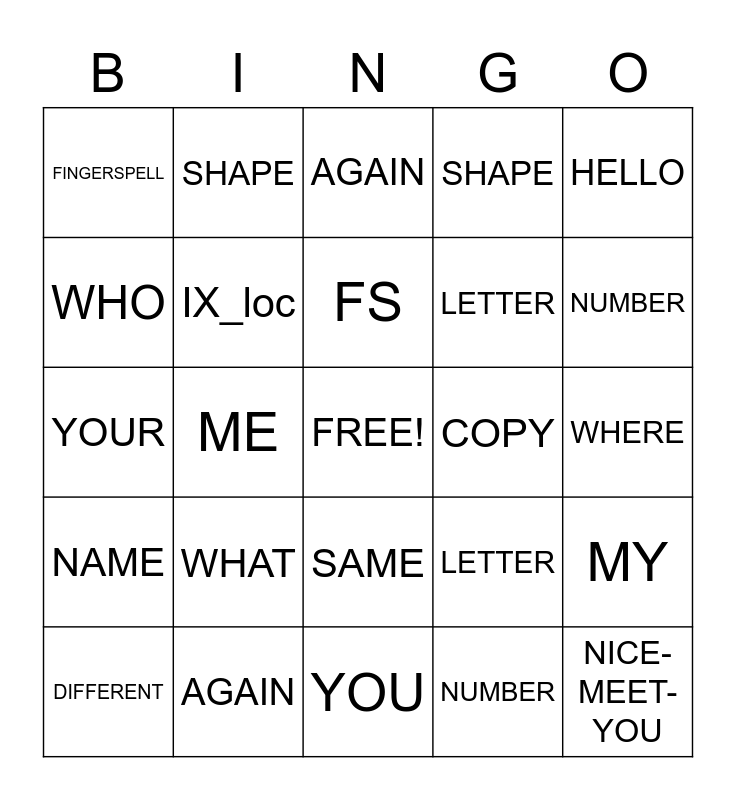 This bingo card has a free space and 24 words: WHAT, AGAIN, FS, DIFFERENT, HELLO, FINGERSPELL, WHO, SHAPE, COPY, SAME, LETTER, YOUR, LETTER, MY, IX_loc, NUMBER, WHERE, AGAIN, NUMBER, ME, NICE-MEET-YOU, NAME, SHAPE and YOU.