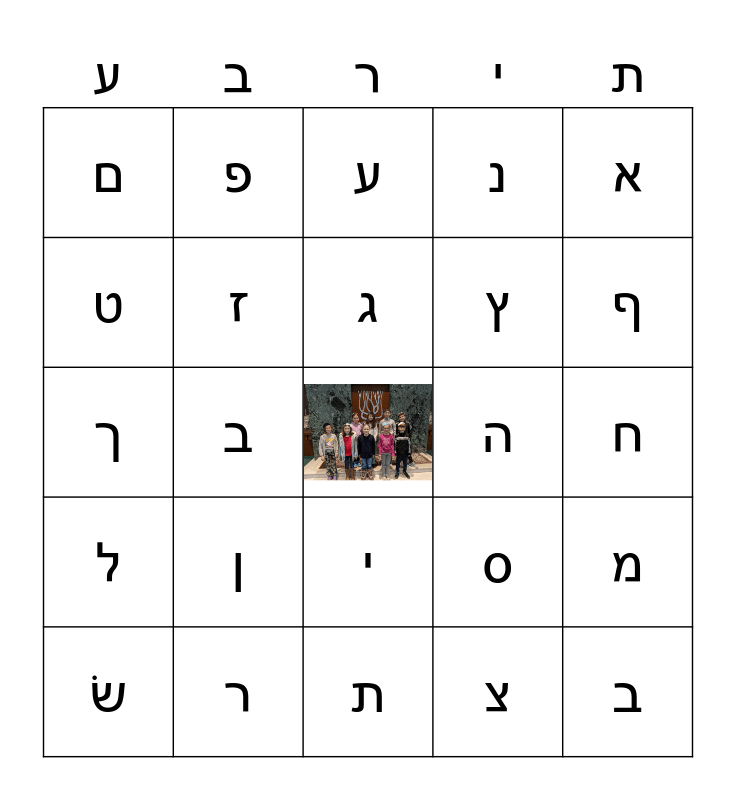 This bingo card has a free space and 27 words: ק, ר, ג, צ, א, ט, פ, ת, ה, מ, ל, ז, ס, ב, ך, שׁ, ע, נ, ח, ם, ן, י, ץ, ף, שׂ, ב and ד.