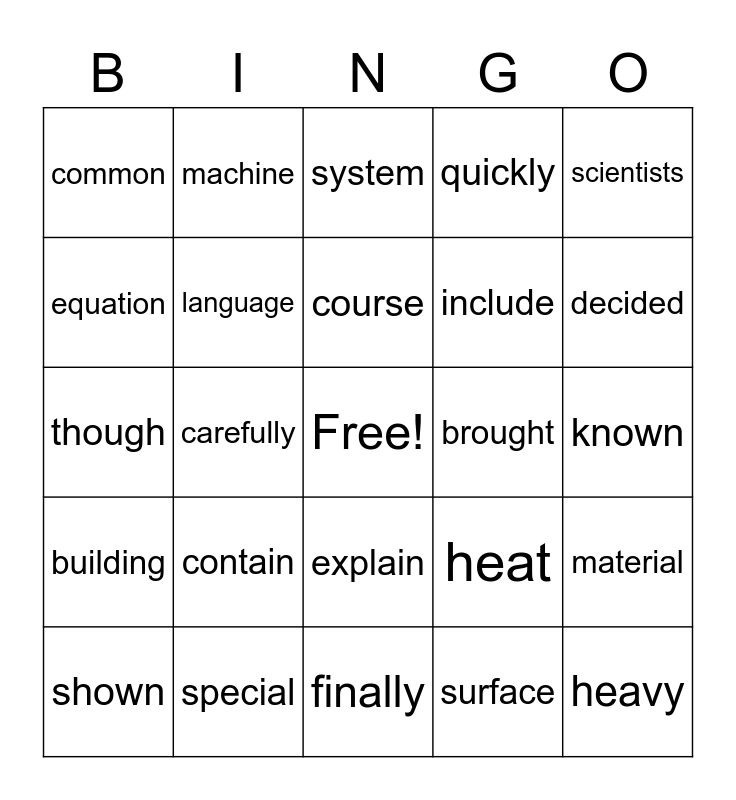 This bingo card has a free space and 24 words: shown, contain, course, surface, scientists, common, machine, system, brought, known, though, language, heat, material, equation, special, finally, quickly, decided, building, carefully, explain, include and heavy.