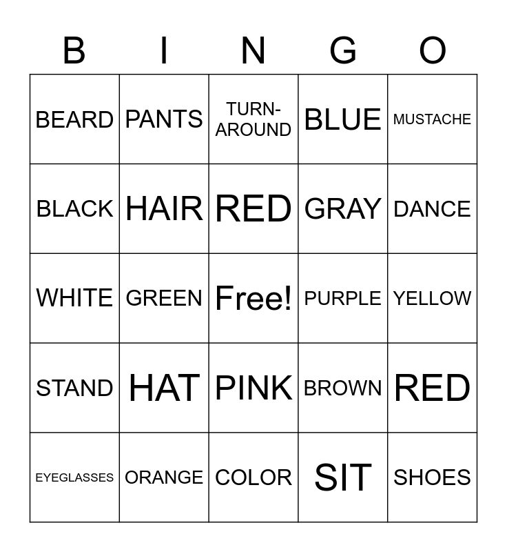 This bingo card has a free space and 24 words: HAT, ORANGE, RED, EYEGLASSES, MUSTACHE, BEARD, BLACK, PANTS, PURPLE, PINK, GRAY, WHITE, BROWN, RED, HAIR, SIT, YELLOW, TURN-AROUND, DANCE, GREEN, SHOES, STAND, BLUE and COLOR.