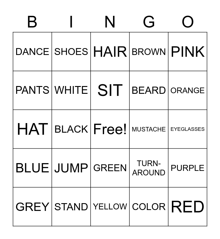 This bingo card has a free space and 24 words: JUMP, STAND, SIT, GREY, PINK, DANCE, PANTS, SHOES, MUSTACHE, GREEN, BEARD, HAT, TURN-AROUND, PURPLE, WHITE, COLOR, EYEGLASSES, HAIR, ORANGE, BLACK, RED, BLUE, BROWN and YELLOW.