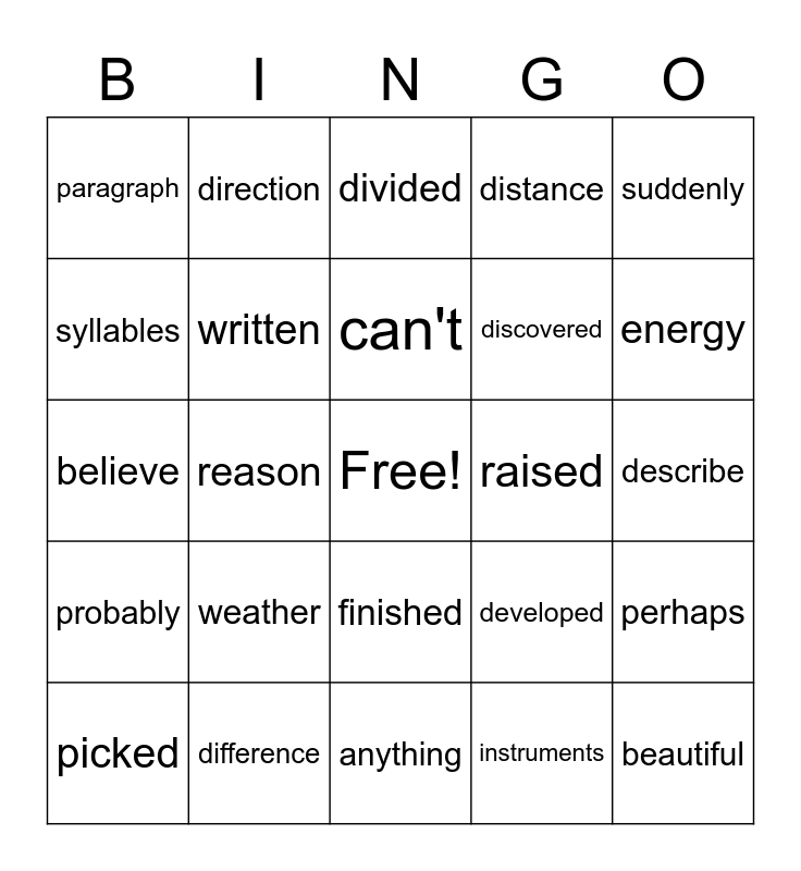 This bingo card has a free space and 24 words: picked, weather, can't, instruments, suddenly, paragraph, direction, divided, raised, describe, believe, written, developed, perhaps, syllables, difference, anything, distance, energy, probably, reason, finished, discovered and beautiful.