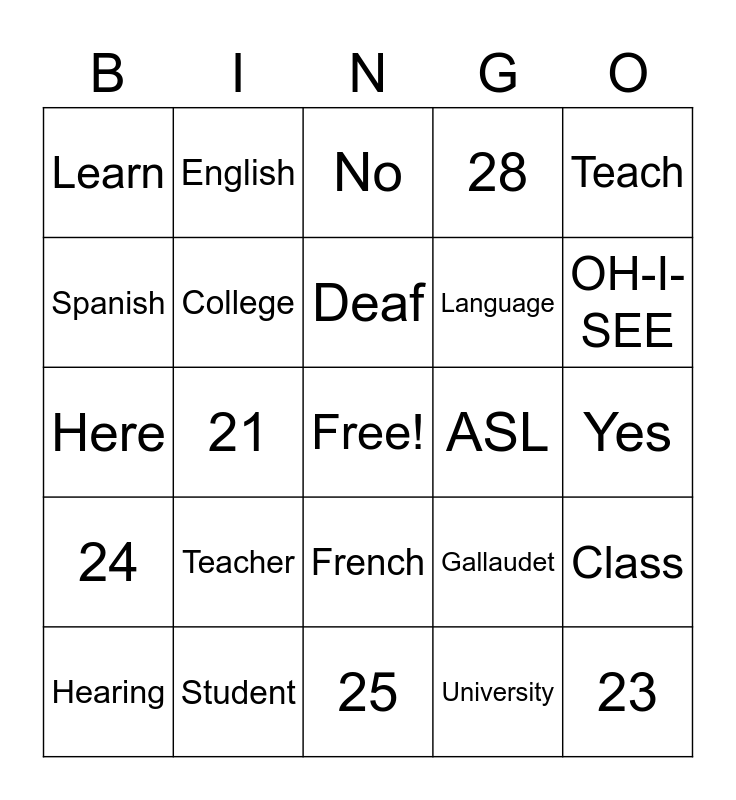 This bingo card has a free space and 24 words: Teacher, Student, Deaf, Hearing, Teach, Learn, Spanish, English, ASL, French, Language, Here, Gallaudet, Class, College, University, Yes, No, OH-I-SEE, 21, 23, 24, 28 and 25.
