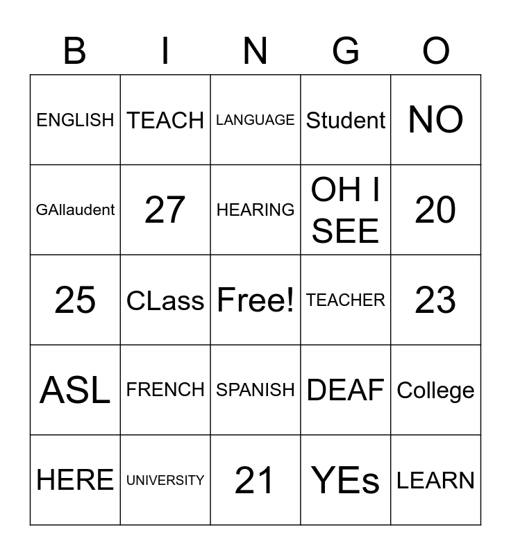 This bingo card has a free space and 24 words: FRENCH, UNIVERSITY, HEARING, HERE, NO, ENGLISH, GAllaudent, TEACH, TEACHER, SPANISH, OH I SEE, 25, DEAF, College, 27, YEs, 23, LANGUAGE, 20, CLass, LEARN, ASL, Student and 21.