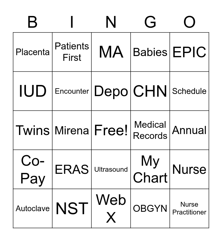 This bingo card has a free space and 60 words: Clip Board, NST, Fetal, Co-Pay, OBGYN, Urine, Encounter, Screening, CHN, Video Visits, Babies, Thank you, IUD, HIPPA, Vitals, Placenta, Nurse Practitioner, EPIC, Scan, Depo, Medical Records, MA, Autoclave, Nurse, OBGYN, Providers, Team Work, Exam, Schedule, Triage, Fetal, PTO, Doc on Call, Intake, Patients First, PRIDE, Smile, Mirena, Pre-Op, Twins, Ablation, ERAS, Annual, Postpartum, My Chart, Glucola, Quest, Swab Culture, Breast Pump, Ultrasound, Web X, LEEP, Name Badge, Insurance, Benefits, Standardization, Dept Call, Grateful, Surgery and Audit.