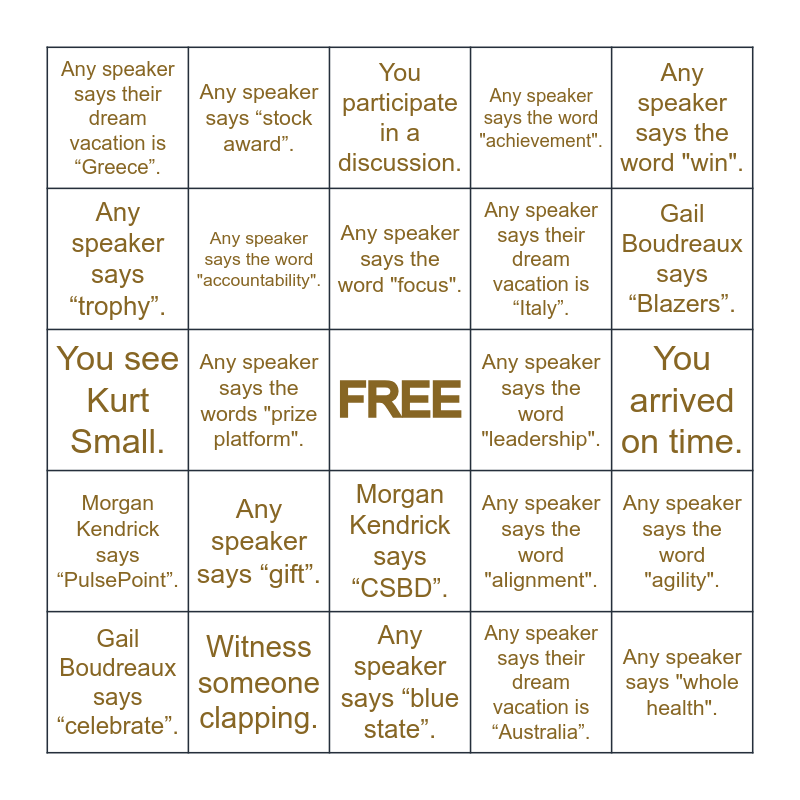 This bingo card has a free space and 48 words: Gail Boudreaux says “congratulations”., Any speaker says "whole health"., Any speaker says “Apple Watch”., Any speaker says “blue state”., Any speaker says “gift”., Any speaker says “jewelry”., Any speaker says “stock award”., Any speaker says “success is sweet”., Any speaker says “trophy”., Any speaker says the word "accomplishment"., Any speaker says the word "accountability"., Any speaker says the word "achievement"., Any speaker says the word "agility"., Any speaker says the word "alignment"., Any speaker says the word "clarity"., Any speaker says the word "committment"., Any speaker says the word "focus"., Any speaker says the word "leadership"., Any speaker says the word "urgency"., Any speaker says the word "win"., Any speaker says the words "prize platform"., Any speaker says their dream vacation is “Australia”., Any speaker says their dream vacation is “Greece”., Any speaker says their dream vacation is “Italy”., Any speaker says their dream vacation that matches yours., Gail Boudreaux says “Blazers”., Gail Boudreaux says “celebrate”., Kurt Small says “Blazers”., Morgan Kendrick says “CSBD”., Morgan Kendrick says “PulsePoint”., Someone makes you laugh., Someone smiles at you., Steve Martenet says “chocolate”., Tricia Fringer says “dessert”., Witness someone clapping., Witness someone eating a chocolate., Witness someone giving a high five., You arrived on time., You clap., You eat a dessert., You make someone laugh., You meet someone new., You participate in a discussion., You see Gail Boudreaux's webcam video on screen., You see Kurt Small., You see Morgan Kendrick., You see Steve Martenet's webcam video on screeen. and You smile..