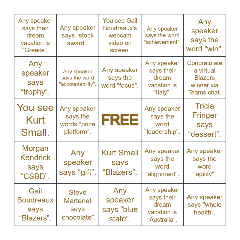 This bingo card has a free space and 47 words: Gail Boudreaux says “congratulations”., Any speaker says "whole health"., Any speaker says “Apple Watch”., Any speaker says “blue state”., Any speaker says “gift”., Any speaker says “jewelry”., Any speaker says “stock award”., Any speaker says “success is sweet”., Any speaker says “trophy”., Any speaker says the word "accomplishment"., Any speaker says the word "accountability"., Any speaker says the word "achievement"., Any speaker says the word "agility"., Any speaker says the word "alignment"., Any speaker says the word "clarity"., Any speaker says the word "committment"., Any speaker says the word "focus"., Any speaker says the word "leadership"., Any speaker says the word "urgency"., Any speaker says the word "win"., Any speaker says the words "prize platform"., Any speaker says their dream vacation is “Australia”., Any speaker says their dream vacation is “Greece”., Any speaker says their dream vacation is “Italy”., Any speaker says their dream vacation that matches yours., Congratulate a virtual Blazers winner via Teams chat., Gail Boudreaux says “Blazers”., Gail Boudreaux says “celebrate”., Kurt Small says “Blazers”., Morgan Kendrick says “CSBD”., Morgan Kendrick says “PulsePoint”., Send a “clapping” reaction in Teams., Share a “thumbs up” reaction in Teams., Share your dream vacation in the Teams chat., Someone makes you laugh., Steve Martenet says “chocolate”., Tricia Fringer says “dessert”., Witness someone clapping., You arrived on time., You clap., You make someone laugh., You see Gail Boudreaux's webcam video on screen., You see Kurt Small., You see Morgan Kendrick., You see Steve Martenet's webcam video on screeen., You smile. and You turn on your webcam video..