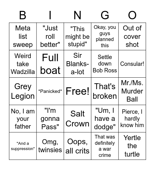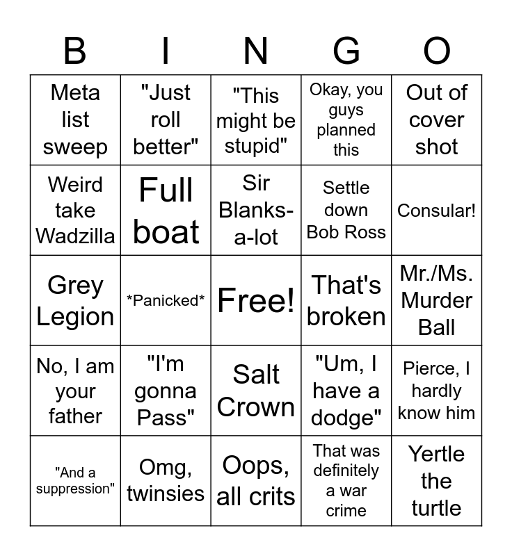 This bingo card has a free space and 25 words: "I'm gonna Pass", Oops, all crits, Sir Blanks-a-lot, "And a suppression", Out of cover shot, Meta list sweep, Weird take Wadzilla, "Just roll better", That's broken, Salt Crown, Settle down Bob Ross, Grey Legion, "Um, I have a dodge", Pierce, I hardly know him, Full boat, Houdini, Mr./Ms. Murder Ball, "This might be stupid", Consular!, *Panicked*, Yertle the turtle, Omg, twinsies, No, I am your father, Okay, you guys planned this and That was definitely a war crime.