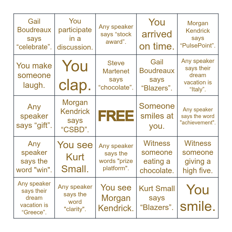 This bingo card has a free space and 48 words: Gail Boudreaux says “congratulations”., You smile., You see Steve Martenet's webcam video on screeen., You see Morgan Kendrick., You see Kurt Small., You see Gail Boudreaux's webcam video on screen., You participate in a discussion., You meet someone new., You make someone laugh., You eat a dessert., You clap., You arrived on time., Witness someone giving a high five., Witness someone eating a chocolate., Witness someone clapping., Tricia Fringer says “dessert”., Steve Martenet says “chocolate”., Someone smiles at you., Someone makes you laugh., Morgan Kendrick says “PulsePoint”., Morgan Kendrick says “CSBD”., Kurt Small says “Blazers”., Gail Boudreaux says “celebrate”., Gail Boudreaux says “Blazers”., Any speaker says their dream vacation that matches yours., Any speaker says their dream vacation is “Italy”., Any speaker says their dream vacation is “Greece”., Any speaker says their dream vacation is “Australia”., Any speaker says the words "prize platform"., Any speaker says the word "win"., Any speaker says the word "urgency"., Any speaker says the word "leadership"., Any speaker says the word "focus"., Any speaker says the word "committment"., Any speaker says the word "clarity"., Any speaker says the word "alignment"., Any speaker says the word "agility"., Any speaker says the word "achievement"., Any speaker says the word "accountability"., Any speaker says the word "accomplishment"., Any speaker says “trophy”., Any speaker says “success is sweet”., Any speaker says “stock award”., Any speaker says “jewelry”., Any speaker says “gift”., Any speaker says “blue state”., Any speaker says “Apple Watch”. and Any speaker says "whole health"..