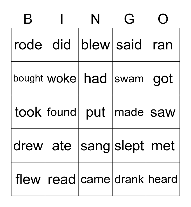 This bingo card has 25 words: ate, came, had, flew, ran, rode, bought, did, made, sang, swam, took, slept, met, woke, heard, saw, blew, got, found, put, read, drew, said and drank.
