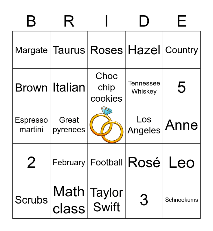 This bingo card has a free space and 29 words: Scrubs, Movies, Great pyrenees, Montague, Margate, Roses, Italian, February, Los Angeles, Math class, Anne, Schnookums, Taylor Swift, 3, 5, Chicago, Football, 2, Country, Espresso martini, Rosé, Pictionary, Tennessee Whiskey, Brown, Hazel, Taurus, Leo, Choc chip cookies and Breakfast.