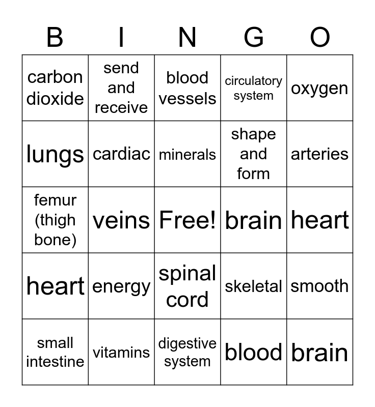 This bingo card has a free space and 24 words: energy, vitamins, minerals, small intestine, oxygen, carbon dioxide, lungs, send and receive, brain, spinal cord, shape and form, femur (thigh bone), skeletal, smooth, cardiac, blood, heart, blood vessels, arteries, veins, brain, heart, circulatory system and digestive system.