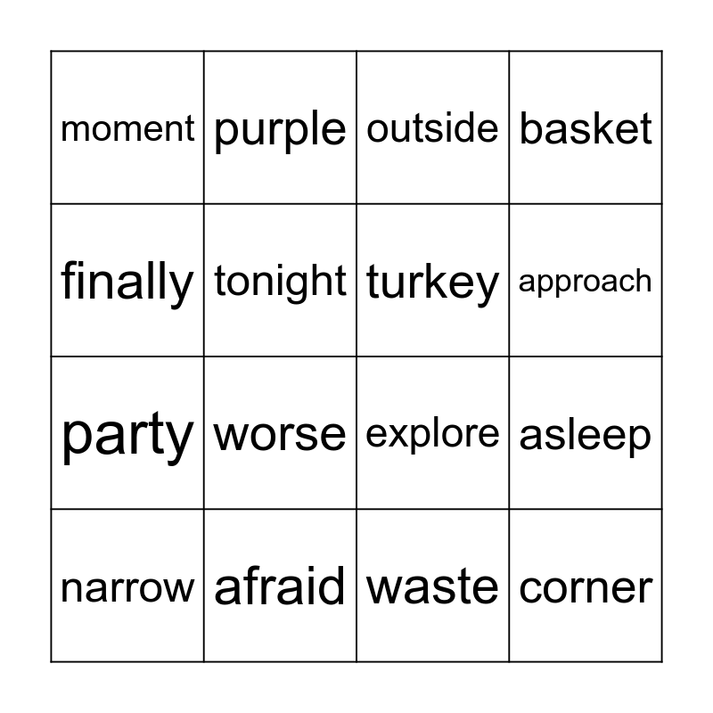 This bingo card has 16 words: afraid, asleep, outside, moment, party, purple, explore, waste, finally, tonight, narrow, basket, worse, approach, turkey and corner.
