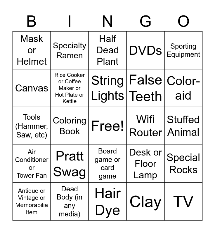 This bingo card has a free space and 24 words: Pratt Swag, Dead Body (in any media), String Lights, Antique or Vintage or Memorabilia Item, Sporting Equipment, Mask or Helmet, Canvas, Specialty Ramen, Wifi Router, Board game or card game, False Teeth, Tools (Hammer, Saw, etc), Desk or Floor Lamp, Special Rocks, Rice Cooker or Coffee Maker or Hot Plate or Kettle, Clay, Stuffed Animal, Half Dead Plant, Color-aid, Coloring Book, TV, Air Conditioner or Tower Fan, DVDs and Hair Dye.
