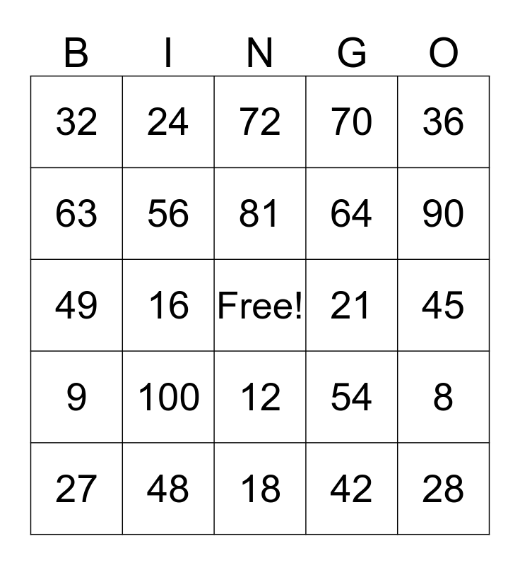 This bingo card has a free space and 24 words: 100, 48, 81, 27, 36, 32, 63, 24, 21, 12, 64, 49, 54, 8, 56, 42, 45, 72, 90, 16, 28, 9, 70 and 18.