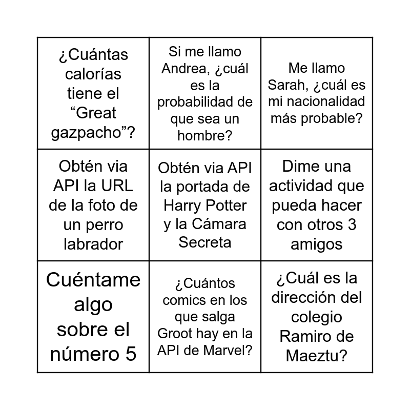 This bingo card has 9 words: Cuéntame algo sobre el número 5, Me llamo Sarah, ¿cuál es mi nacionalidad más probable?, Si me llamo Andrea, ¿cuál es la probabilidad de que sea un hombre?, Obtén via API la URL de la foto de un perro labrador, ¿Cuántas calorías tiene el “Great gazpacho”?, Dime una actividad que pueda hacer con otros 3 amigos, Obtén via API la portada de Harry Potter y la Cámara Secreta, ¿Cuál es la dirección del colegio Ramiro de Maeztu? and ¿Cuántos comics en los que salga Groot hay en la API de Marvel?.