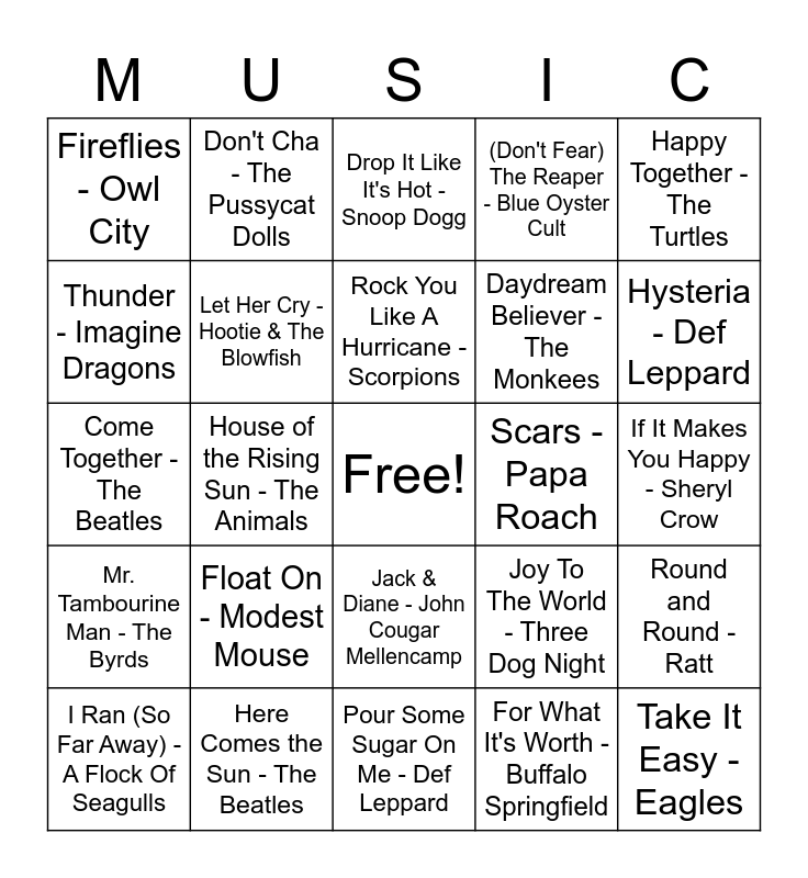 This bingo card has a free space and 50 words: I'm a Believer - The Monkees, Take It Easy - Eagles, Magic Carpet Ride - Steppenwolf, Pour Some Sugar On Me - Def Leppard, Float On - Modest Mouse, Clint Eastwood - Gorillaz, Don't Cha - The Pussycat Dolls, Mr. Jones - Counting Crows, Thunder - Imagine Dragons, Turn! Turn! Turn! - The Byrds, Let Her Cry - Hootie & The Blowfish, (Don't Fear) The Reaper - Blue Oyster Cult, Round and Round - Ratt, Joy To The World - Three Dog Night, Here I Go Again - Whitesnake, When the Children Cry - White Lion, Rock You Like A Hurricane - Scorpions, Scars - Papa Roach, Sorry - Buckcherry, Happy Together - The Turtles, House of the Rising Sun - The Animals, For What It's Worth - Buffalo Springfield, Fireflies - Owl City, Daydream Believer - The Monkees, Hotel California - Eagles, Born To Be Wild - Steppenwolf, Hysteria - Def Leppard, Only Wanna Be With You - Hootie & The Blowfish, Drop It Like It's Hot - Snoop Dogg, Jack & Diane - John Cougar Mellencamp, Buttons - The Pussycat Dolls, All I Wanna Do - Sheryl Crow, Wagon Wheel - Old Crow Medicine Show, Cowboy Take Me Away - The Chicks, Here Comes the Sun - The Beatles, Wind of Change - Scorpions, Feel Good Inc. - Gorillaz, Hurts So Good - John Cougar Mellencamp, No One's Gonna Love You - Band of Horses, If It Makes You Happy - Sheryl Crow, Accidentally In Love - Counting Crows, Believer - Imagine Dragons, There's Your Trouble - The Chicks, Life in the Fast Lane - Eagles, I Ran (So Far Away) - A Flock Of Seagulls, Come Together - The Beatles, 5 Years Time - Noah And The Whale, Ain't No Rest for the Wicked - Cage The Elephant, Mr. Tambourine Man - The Byrds and Yellow Submarine - The Beatles.