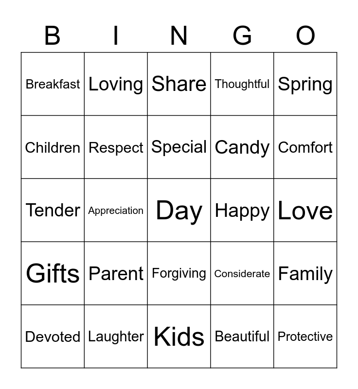 This bingo card has 46 words: Mother, Day, Mom, Kids, Parent, Holiday, Loving, Caring, Children, Grandmother, Respect, Thoughtful, Family, Considerate, Honor, Giving, Special, Happy, May, Spring, Appreciation, Beautiful, Breakfast, Candy, Charming, Comfort, Devoted, Flowers, Forgiving, Gifts, Guidance, Hugs, Jewelry, Joy, Kisses, Laughter, Love, Material, Nurture, Perfume, Protective, Share, Tender, Warm, Wise and Mama.