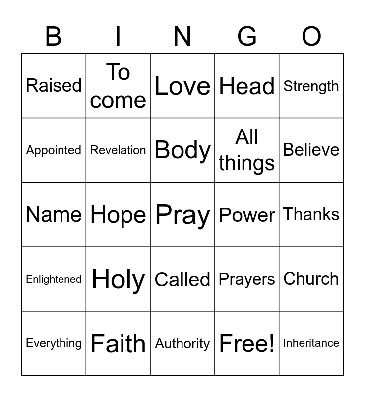This bingo card has 30 words: Faith, Wisdom, Hope, Incomparably, Raised, Love, Revelation, Called, Power, Authority, Thanks, Pray, Free!, Inheritance, Believe, Dominion, Prayers, Enlightened, Holy, Strength, Name, Present, To come, All things, Appointed, Head, Church, Everything, Body and Mighty.