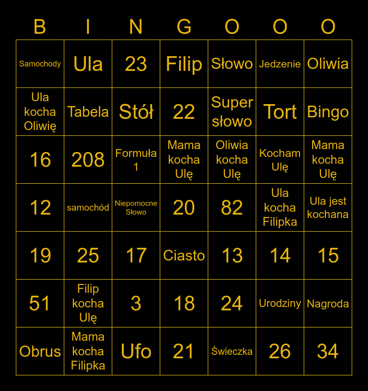 This bingo card has 49 words: Urodziny, Tort, Świeczka, samochód, Formuła 1, Ula jest kochana, Ula, Ufo, Jedzenie, Ciasto, Oliwia, Filip, Kocham Ulę, Oliwia kocha Ulę, Filip kocha Ulę, Ula kocha Filipka, Ula kocha Oliwię, Bingo, Nagroda, Słowo, Super słowo, Niepomocne Słowo, Samochody, Tabela, Obrus, Stół, Mama kocha Ulę, Mama kocha Filipka, Mama kocha Ulę, 208, 34, 82, 51, 3, 12, 13, 14, 15, 16, 17, 18, 19, 20, 21, 22, 23, 24, 25 and 26.