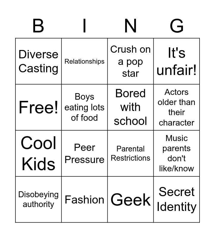 This bingo card has 16 words: Fashion, Music parents don't like/know, Crush on a pop star, Diverse Casting, Cool Kids, Relationships, Parental Restrictions, Geek, Free!, Boys eating lots of food, Disobeying authority, It's unfair!, Peer Pressure, Actors older than their character, Bored with school and Secret Identity.