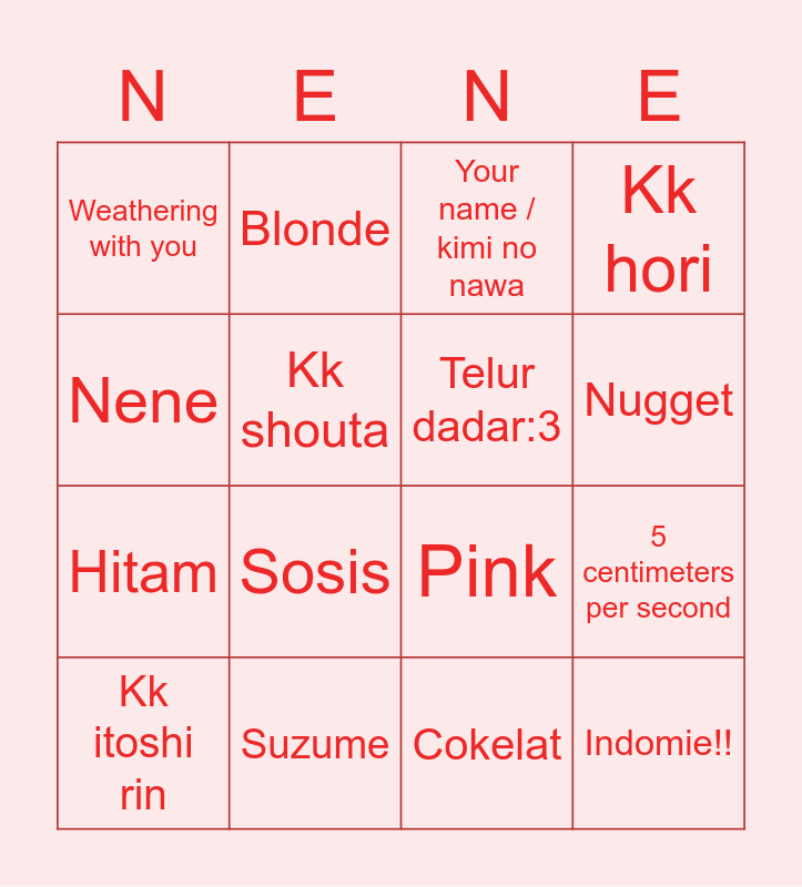 This bingo card has 16 words: Suzume, 5 centimeters per second, Your name / kimi no nawa, Weathering with you, Hitam, Blonde, Pink, Cokelat, Nene, Kk shouta, Kk itoshi rin, Kk hori, Sosis, Nugget, Telur dadar:3 and Indomie!!.
