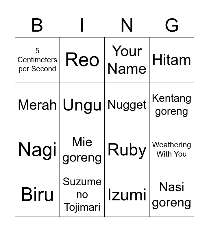 This bingo card has 16 words: Suzume no Tojimari, Weathering With You, Your Name, 5 Centimeters per Second, Nagi, Reo, Ruby, Izumi, Merah, Ungu, Biru, Hitam, Mie goreng, Kentang goreng, Nugget and Nasi goreng.