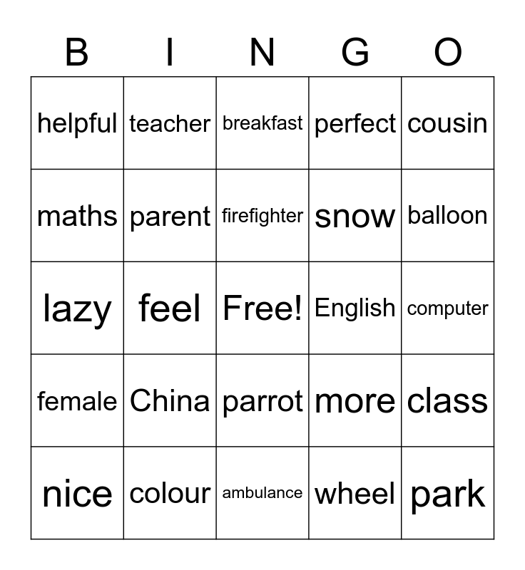This bingo card has a free space and 34 words: speak, wheel, wide, weather, female, parent, cousin, nice, teacher, police, firefighter, breakfast, morning, spring, English, balloon, colour, lazy, China, more, parrot, animal, helpful, computer, ambulance, park, perfect, number, snow, maths, afraid, feel, class and week.